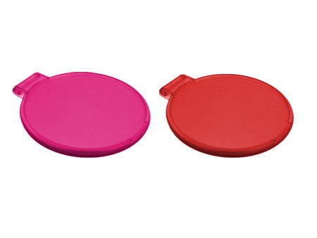 Espejo de plástico portátil redondo. Disponibles en colores azul, blanco, morado, naranja, rojo, rosa, verde y traslucido.
