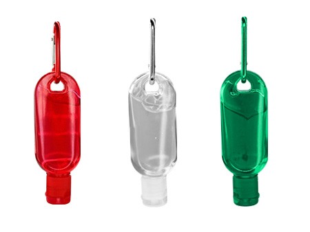 Botella de plástico color azul con gel antibacterial de 30 ml. Incluye gancho