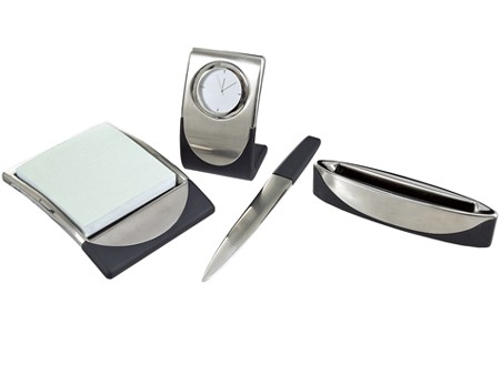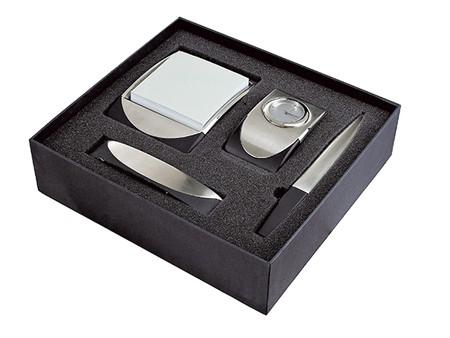 SET DE ESCRITORIO MONARCA (INCLUYE RELOJ, PORTA NOTAS (100 HOJAS), ABRECARTAS, TARJETERO Y CAJA DE REGALO.)