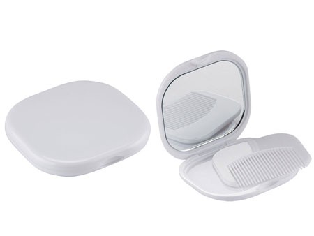 Cepillo de cerdas redondeadas con costurero en su base y espejo. Medidas: 6.5 cm x 2 cm. Material: Plástico. Técnica de impresión recomendada: Tampografía.