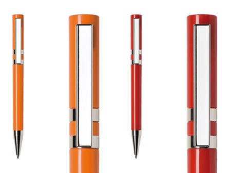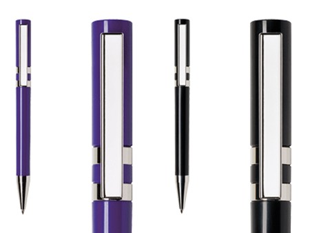 Bolígrafo plástico marca Maxema 2,500 metros de escritura clip rectangular. Diseño en colores mate azul, blanco, morado, negro, naranja, rojo y verde. Con clip, arillos y punta cromada.