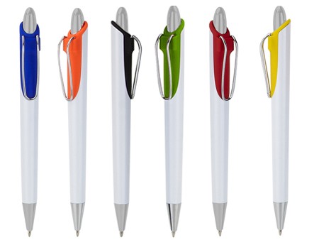Bolígrafo plástico marca PL, en colores azul, negro, naranja, rojo y verde.