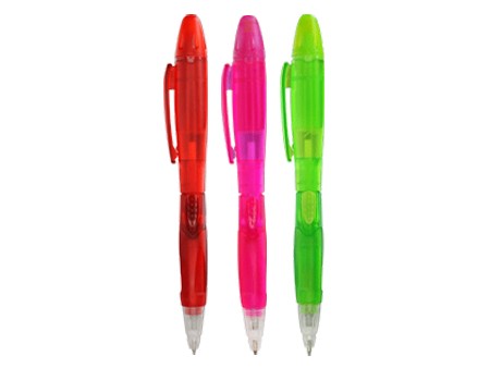 Bolígrafo plástico marca PL con marcatextos blossom, en colores amarillo, azul, blanco, morado, negro, naranja, rojo, rosa y verde.