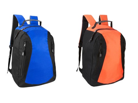 Mochila fabricada en poliester con bolsa frontal y compartimentos de malla en cada lado disponible en negro, rojo, azul, naranja, amarillo y verde medidas 28x38x10.5 cm