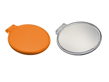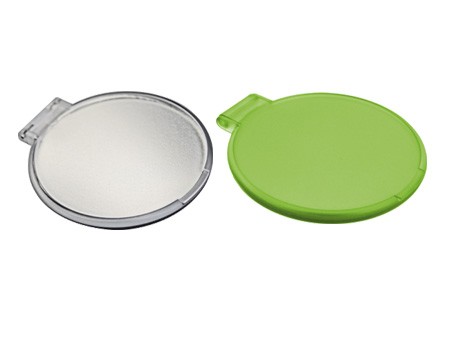 Espejo de plástico portátil redondo. Disponibles en colores azul, blanco, morado, naranja, rojo, rosa, verde y traslucido.