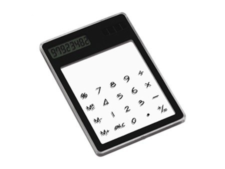 Calculadora de escritorio de 8 dígitos con diseño en forma cuadrada, acabado en acrílico transparente y franja de color en filo (azul, negro y rojo). Foto celda de luz para funcionamiento y números de teclado impresos en color negro.